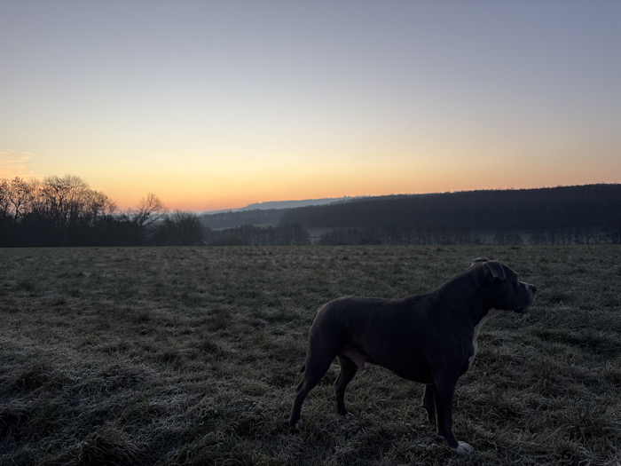 A gray pit bull stands in a frost-covered field at dawn. The dog faces right, its silhouette defined against the brightening sky. Behind it, a row of trees lines the horizon, transitioning into a darker, wooded area. The sky is a gradient of soft blues and oranges, indicating sunrise or sunset. The landscape is serene and expansive.