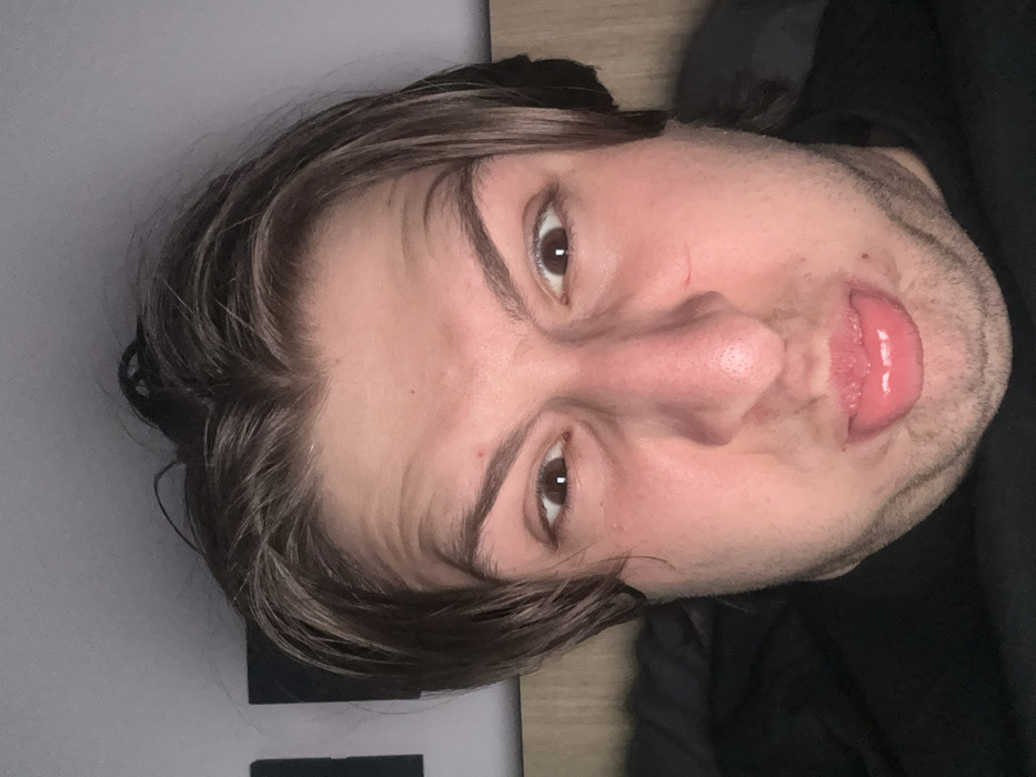 The image displays a close-up, headshot perspective of an adult male in Novate Milanese, Italy. The individual exhibits a distinct facial expression, characterized by a furrowed forehead, wide-open eyes with dark irises, and distended cheeks. The mouth is pursed, with the lower lip pushed forward, and the tip of a pink tongue is visible. Minor stubble is present on the chin and jawline. Hair is dark brown with lighter highlights, appearing medium in length and casually styled, falling around the face. A small reddish mark is visible on the left side of the forehead, and a faint mark is present on the right cheek. The subject wears a black garment, partially visible at the bottom of the frame. The background is an indoor setting, with a light-colored wall (possibly grey or light purple) visible. A dark, rectangular object is partially visible in the upper left, and a light brown, possibly wooden, surface is present on the right side of the frame, likely representing furniture. Illumination appears to be from a soft, direct front source.