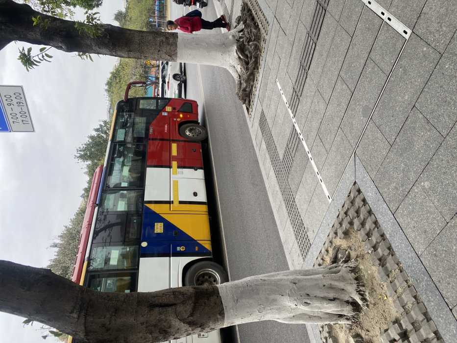 A long bus is parked on the side of a street next to a sidewalk. The bus has a color scheme of red, white, yellow, and blue. A woman wearing a red jacket is walking on the sidewalk near the back of the bus. Two trees stand on the edge of the sidewalk, with their trunks painted white at the bottom. The sidewalk is made of gray pavers with tactile paving sections. A parking sign is visible, indicating parking hours between 7:00-9:00 and 17:00-19:00.