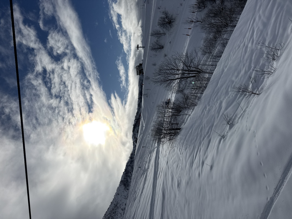 The image displays a snow-covered mountain landscape within a ski resort in Limone Piemonte, Italy, under a sky featuring both blue patches and scattered white clouds. A prominent, bright sun, partially obscured by clouds and exhibiting a circular halo effect, is situated in the upper left quadrant. A dark, taut cable, indicative of a ski lift, traverses horizontally across the upper portion of the frame. The terrain consists of expansive, snow-laden slopes, marked by numerous ski tracks on the pristine white surface. Sparse, bare deciduous trees are visible, particularly forming a cluster along a diagonal line from the mid-ground to the lower right. On the upper left slope, two individuals are discernible on skis, descending the mountain. In the mid-ground, towards the right, a multi-story building, likely a ski lodge or lift station, stands on a crest, adjacent to a ski lift tower. Further down the slope to the right, multiple red and black poles, consistent with ski trail markers or safety netting, are present. A red snow groomer is partially visible nestled among the trees on the right side of the main slope. The scene depicts a bright, cold, winter day at an active ski area.
