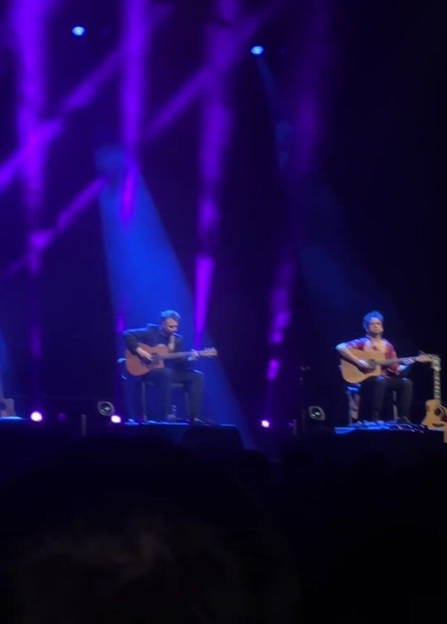 concert scene with two male guitarists performing on stage. They are seated on stools, each playing an acoustic guitar. The stage is dark, illuminated by bright purple and blue spotlights that create an atmospheric effect. In front of the stage, an audience is visible, though they are mostly in shadow. The focus is on the performers and the lighting.