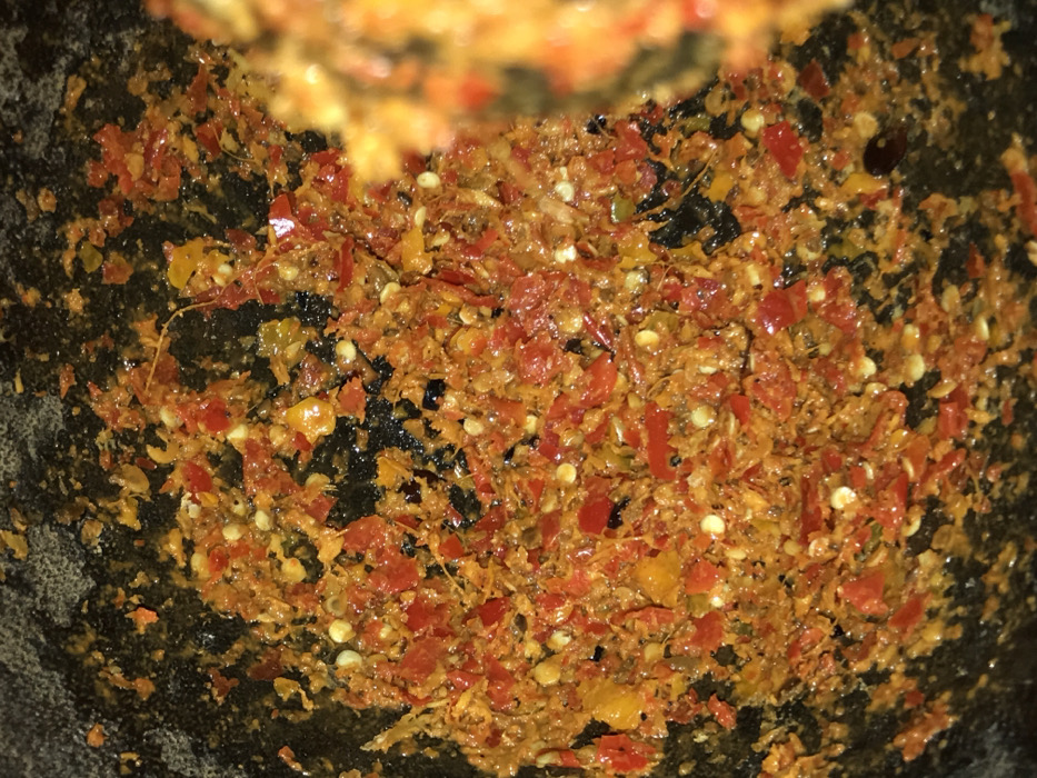 A close-up view of a dark gray stone mortar filled with a mixture of crushed ingredients. The dominant color is red, derived from chopped red chili peppers. Visible are small white seeds, likely from the chilies. The texture appears wet and slightly oily. Some darker, almost black, fragments are mixed in, possibly burnt garlic or other spices. The ingredients are coarsely ground and not entirely homogenous.