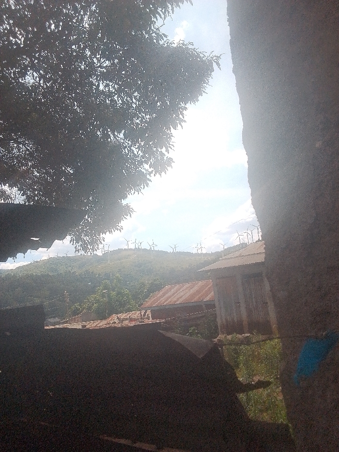 This daytime image depicts a scene within Ngong ward, Kenya, observed from a partially obscured vantage point. A dense, dark tree canopy occupies the upper left, casting shadows. Below it, a dark corrugated metal roof is partially visible. A rough, vertical, textured wall or pillar runs along the right edge of the frame, displaying a small blue mark near its lower section. In the midground, several structures with corrugated roofs are present; one prominent building features a weathered facade and a grey metal roof, while another to its left has a reddish-brown corrugated roof. The background consists of vegetated hills, upon the crests of which numerous wind turbines are visible. The sky above is bright with scattered clouds. No individuals or dynamic actions are depicted.