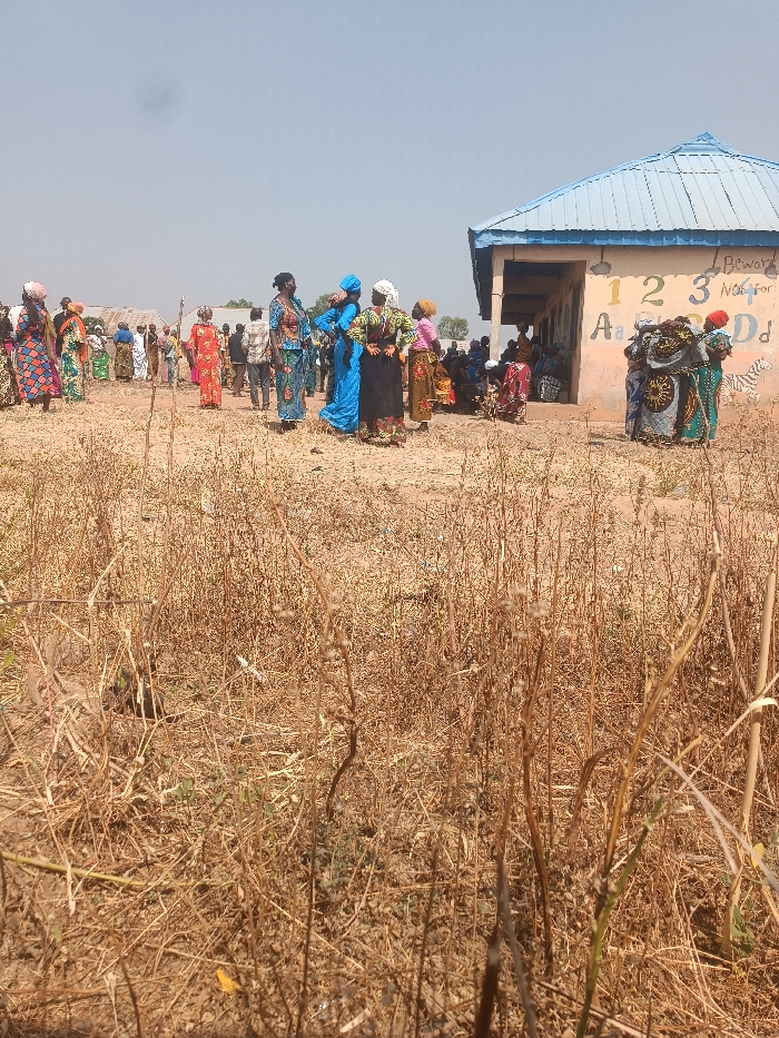An outdoor scene in Rido, Nigeria, depicts a gathering of individuals under a clear sky