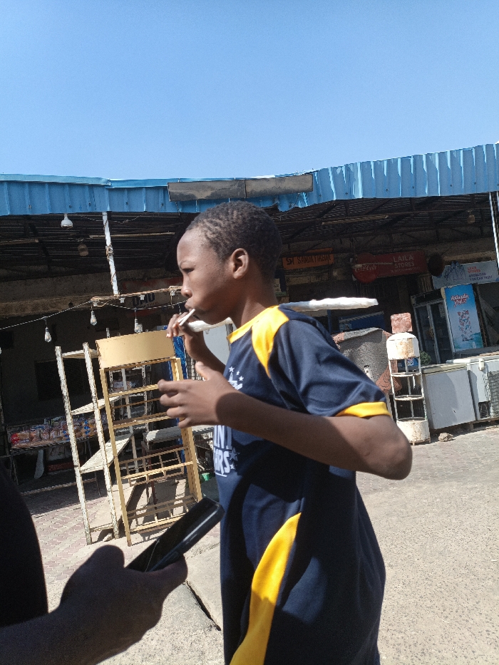 The image depicts an outdoor commercial area in Tarauni, Nigeria, under a clear blue sky. A young male individual, appearing to be an adolescent, is prominently featured in profile, facing left. He has short dark hair and dark skin, and is wearing a dark blue short-sleeved shirt with yellow panels on the shoulders and sides. A thin, white cylindrical object is positioned at his mouth. A larger, elongated white object, possibly a rolled item, rests across his right shoulder, extending behind his head. His right hand is raised with fingers slightly curled. In the lower left foreground, the dark-skinned left arm and hand of another individual are visible, holding a black smartphone horizontally. The background consists of a row of open-fronted shops or stalls beneath a light blue corrugated metal roof. Bare light bulbs are strung across the shop fronts. Visible signage includes "LAILA STORES," "Coca-Cola" branding, and partially obscured text reading "ST SANORI TINGBA." To the left, a multi-tiered wooden display stand is visible near a table holding various packaged goods. To the right, multiple disused refrigeration units and a tall, white, cylindrical object resembling an old dispenser or pump are present. The ground is paved with light-colored material, consistent with concrete or pavers.