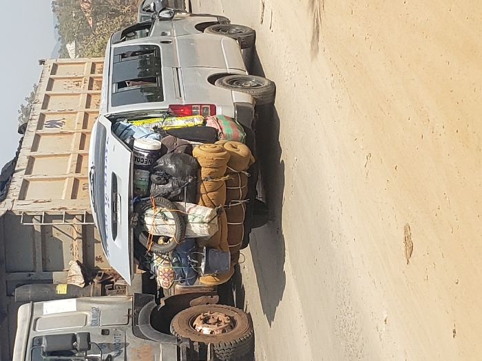 A silver-colored passenger van, overloaded with various items, is depicted on a light brown, dusty road in Zongon Daji, Nigeria