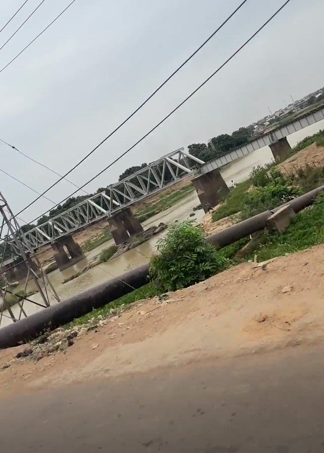 view from a moving vehicle of a bridge over a river. The river is wide and shallow, with a muddy color. The bridge has a steel truss design and sits on concrete pillars in the water. Utility poles and lines are visible along the roadside and overhead. There's also a large pipe running parallel to the road near the riverbank. A man is seen riding a bicycle on the road toward the bridge. The sky is overcast, suggesting a dull or rainy day. The environment includes dirt, gravel, and some sparse vegetation along the riverbank and roadside. The road itself is paved but shows signs of wear.