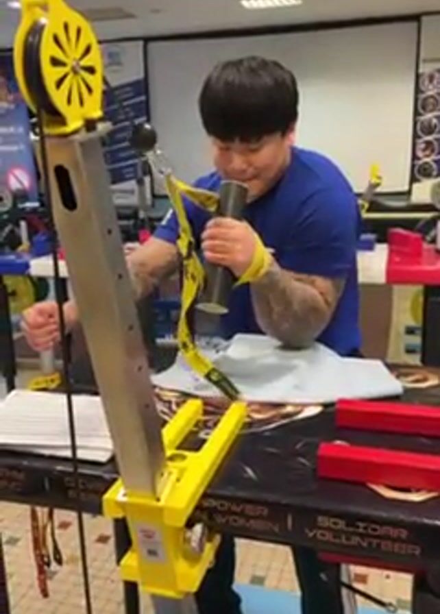 A man wearing a blue shirt and with tattoos on his arms is standing behind a table, using a piece of equipment to lift a cylindrical weight. The equipment has a tall, gray metal pole with yellow supports and a pulley system at the top. A yellow strap is attached to the weight, and the man is using a handle on the side of the pole to raise the weight. The table is covered with a black surface that has text printed on it. There are also red blocks on the table. The man has a wrist strap on his left wrist. The floor is blue. In the background, there is a projector screen, posters, and other tables with equipment.