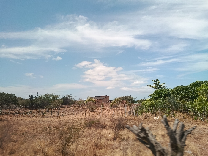 The scene depicts a rural landscape in Las Hernández, Venezuela, under a bright blue sky with scattered white cumulus and cirrus clouds. The foreground consists of dry, golden-brown grasses and sparse, arid vegetation. A blurry, multi-branched, dead plant or tree stump occupies the immediate lower right. Across the midground, a rudimentary fence line is constructed from vertical wooden posts and thinner horizontal elements, enclosing a field of similar dry vegetation. Behind this fence, a variety of green trees and shrubs are visible, including tall, segmented cacti on the left. A light-colored animal, possibly a goat or dog, stands near a patch of green foliage on the right side of the fence line. In the background, a two-story, light brown or terracotta-colored building with a dark roof is partially obscured by trees, positioned slightly left of center. No human subjects, specific actions, or interactions are observable. The environment suggests an arid or semi-arid climate.