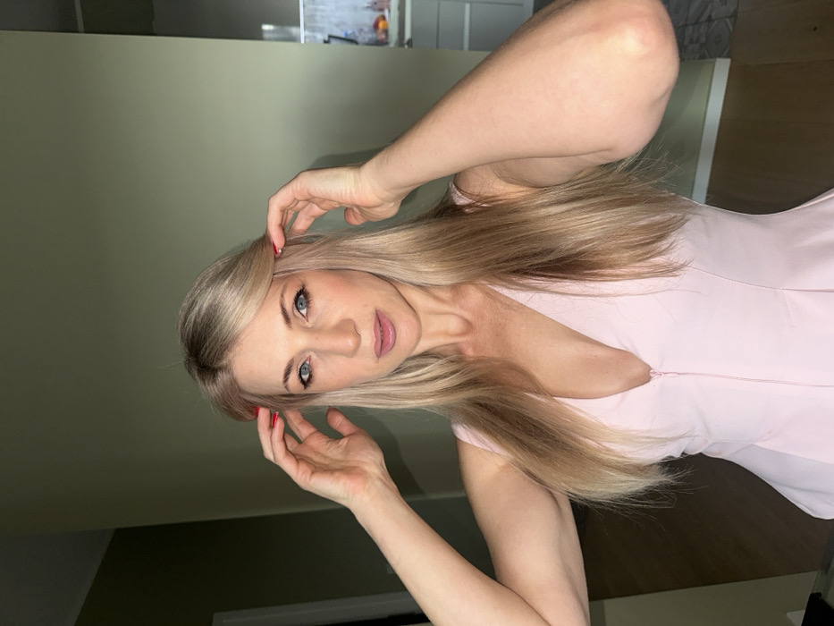 An adult female is depicted in an indoor setting. She possesses long, straight, blonde hair with a central part, blue eyes, and fair skin, appearing to be in her 30s or 40s. She is wearing a light pink sleeveless top or dress featuring a deep V-neckline and a visible central front zipper. Her fingernails are painted red. Both hands are raised, with fingers spread, positioned near her temples, suggesting an action of adjusting or styling her hair. She maintains direct eye contact with the camera, exhibiting a neutral to slightly serene facial expression. The background consists of a plain, light olive-green wall. To the right, a partial view of an adjacent room, likely a kitchen, is visible, showing light-colored cabinetry and possibly objects on a counter. The environment appears to be a domestic interior. No specific architectural features or landmarks are present to definitively identify the location as being within the city of Berlin, Germany.