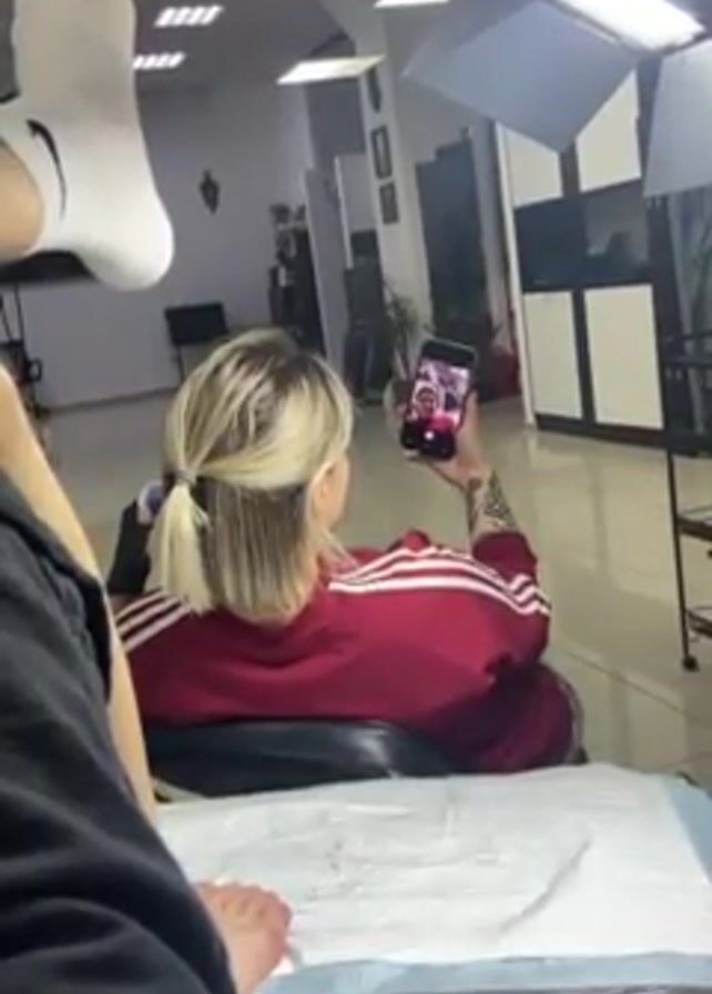 Here is a detailed description of the video. A person wearing a burgundy Adidas sweatshirt is seated in a tattoo parlor, taking a selfie video with their iPhone. The phone screen shows their face while they film. The individual has a blonde, shoulder-length hairstyle pulled back in a short ponytail. Their left arm has a visible tattoo. In the foreground, another person, wearing a black garment, is preparing for a tattoo session, and a covered table can be seen. The setting is a bright tattoo studio with professional lighting equipment overhead and decor including plants. The walls are white, and a tall cabinet is behind the subject.
