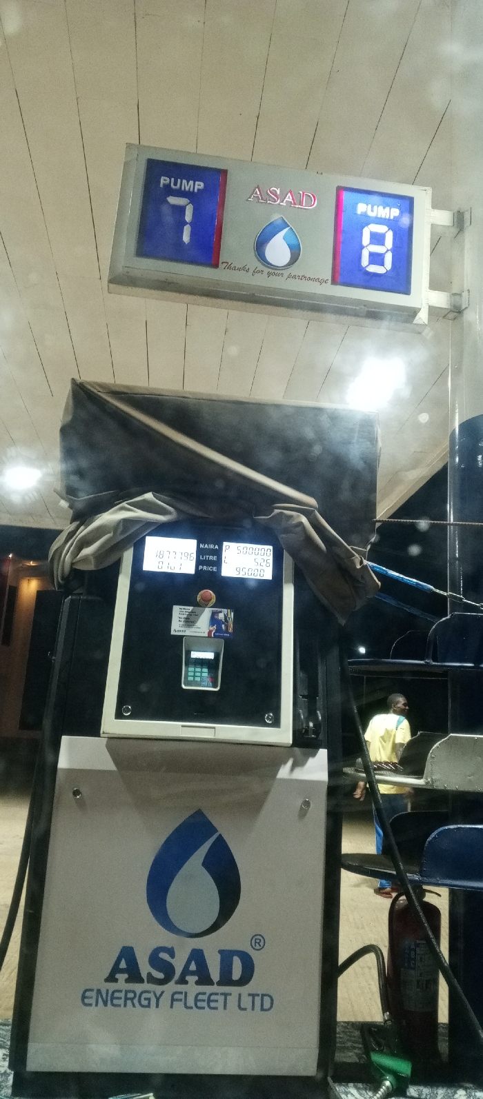 The image depicts a nighttime scene at an ASAD Energy Fleet Ltd. petrol station in Kwarau, Nigeria. A prominent fuel pump displays digital readings: "NAIRA P 500000", "LITRE L 5.26", "PRICE 95000", and additional values "1877196" and "0161". The pump features a visible payment keypad and a red emergency stop button. A dark, possibly protective, cover is draped over the upper section of the pump. Overhead, an illuminated sign shows "PUMP 7" and "PUMP 8" flanking a central panel with the ASAD logo and "Thanks for your patronage". A green fuel nozzle is visible near the pump's base, alongside a partially obscured red fire extinguisher. In the mid-ground to the right, a male individual wearing a yellow shirt and blue trousers is standing. The area is illuminated by artificial overhead lighting, casting reflections on the surfaces.