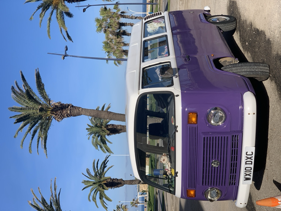 - "A two-tone purple and white Volkswagen Type 2 (Bay Window) camper van is parked outdoors on a paved surface, partially covered in gravel, under a clear blue sky in M'diq, Morocco" by FM-Gn7EC2, licensed under CC BY 4.0