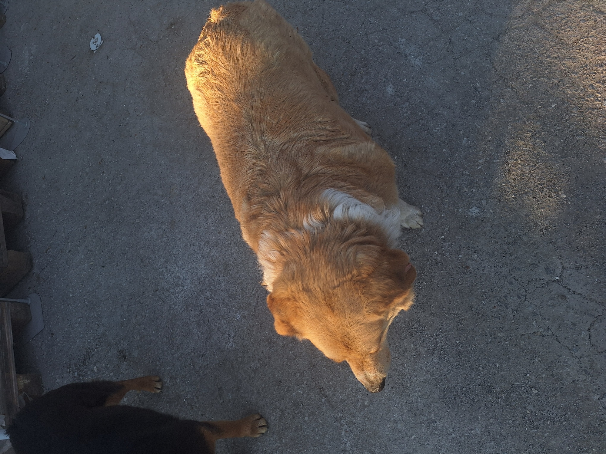 A high-angle shot shows two dogs on a paved surface in an outdoor setting. The first dog, predominantly golden brown, occupies the center of the frame. The second dog, located at the bottom left, is black with brown legs. The background is a gray, cracked surface. To the left are wooden planks. The location is Targovishte, Bulgaria.