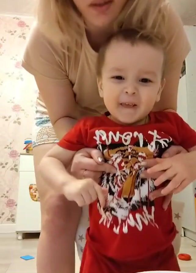 - "A woman with shoulder-length blonde hair puts a large, bib-like item on a small child wearing a red shirt with a tiger on it" by FM-9xtHL2, licensed under CC BY 4.0