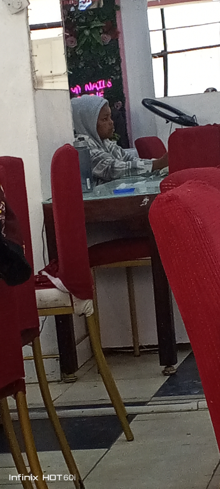 A person wearing a hooded sweatshirt sits at a table in a salon. The table has a glass top and a dark wooden base. A ring light is nearby. Several chairs with red cushions and backs are visible in the foreground. A neon sign that reads "MY NAILS" is placed against a wall with floral decorations in the background. The floor has a grey and white tiled pattern. A watermark indicating "Infinix HOT 60i" is visible at the bottom left corner.