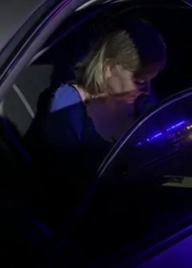 A woman with blonde hair and wearing a blue shirt is inside a car with the window open, looking down and appearing to write on something on the dashboard. The scene is very dark, with only dim blue lights visible on the window and interior of the car. The environment appears to be a parking lot or a dark street. There is background noise of a party or music.