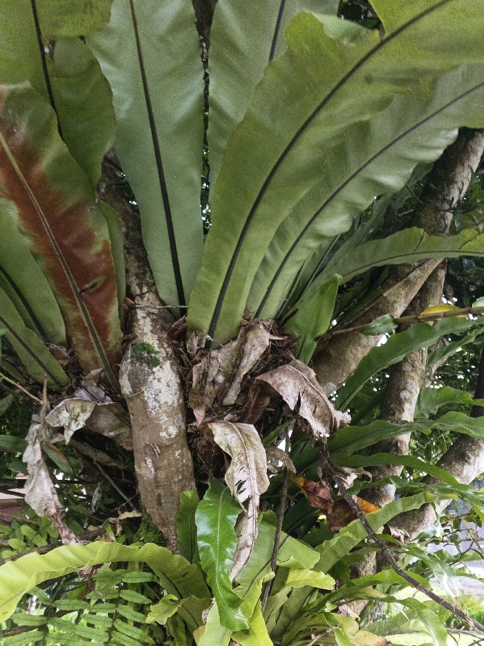 - "The image displays a close-up, vertical shot of a cluster of large Bird's Nest Ferns (*Asplenium nidus*) growing epiphytically on a tree trunk" by FM-VCndm1, licensed under CC BY 4.0