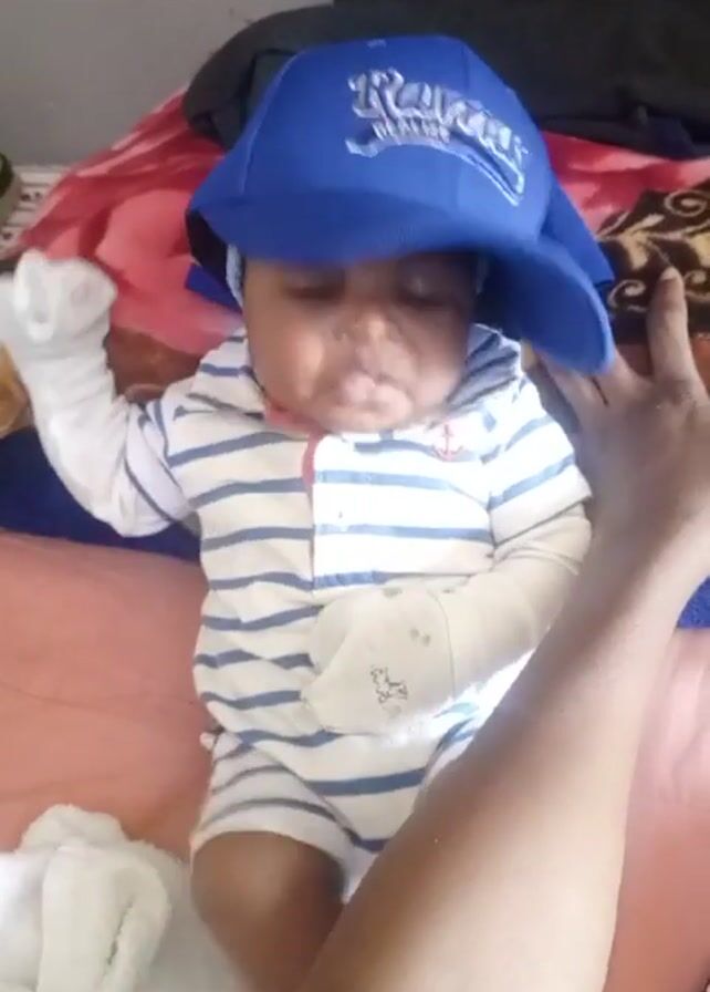 A baby lies on their back on a patterned blanket wearing a blue and white striped onesie and a large blue baseball cap with white lettering. A dark-skinned hand adjusts the cap on the baby's head. The baby's left arm is partially covered in a white wrap. The blanket has a colorful, swirling pattern.