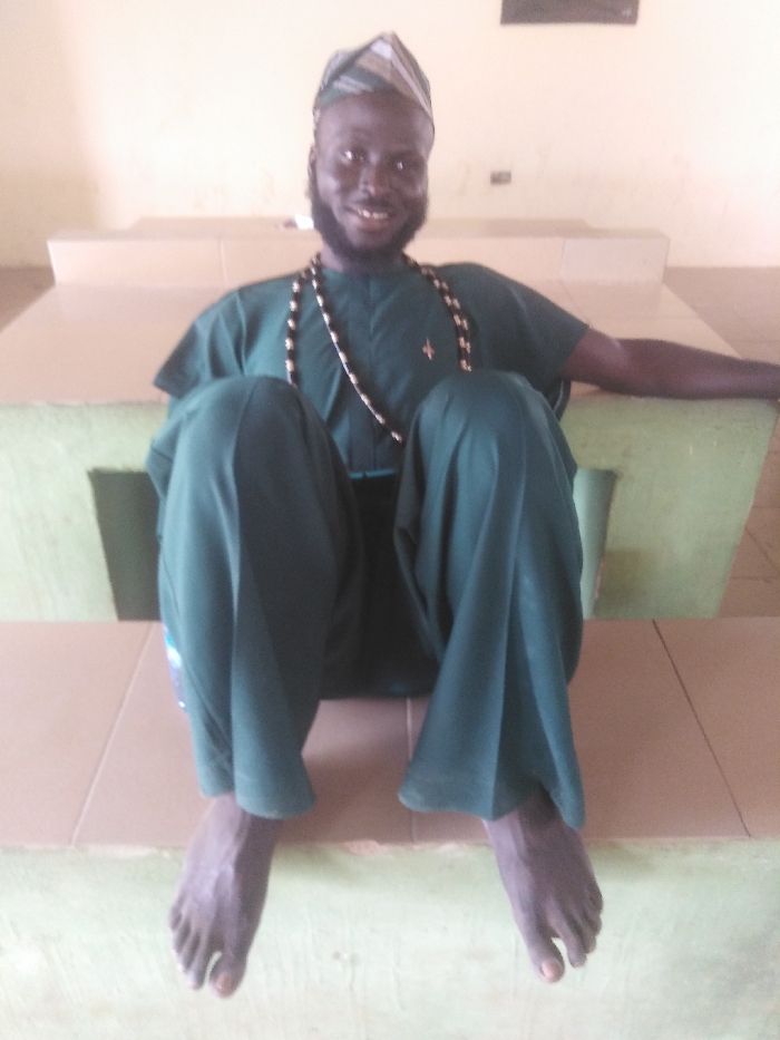 An adult male is seated in a light green-painted concrete structure with light brown tiled or painted surfaces, located in Kaninkon, Nigeria