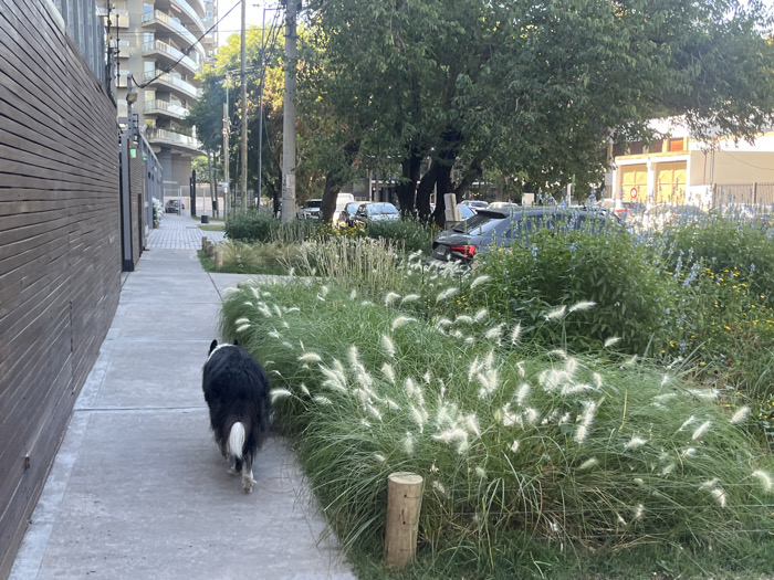 The image depicts an outdoor urban scene in Vicente López, Argentina. A black and white dog walks away from the viewer on a concrete sidewalk. To the right of the sidewalk, a landscaped area features dense ornamental grass with prominent white seed heads, green shrubs, and blue-flowering plants. A short wooden post is visible in the lower right corner of the landscaped area. To the left of the sidewalk, a building with a horizontal slatted wooden facade extends into the midground. In the background, a street runs parallel, populated with parked vehicles, including a dark sedan, partially obscured by trees and additional greenery. Utility poles with overhead wires are visible. A multi-story residential building with balconies is present in the mid-distance on the left, and a building with large rectangular doors is visible on the far right. The scene is illuminated by natural light, indicative of daytime conditions.