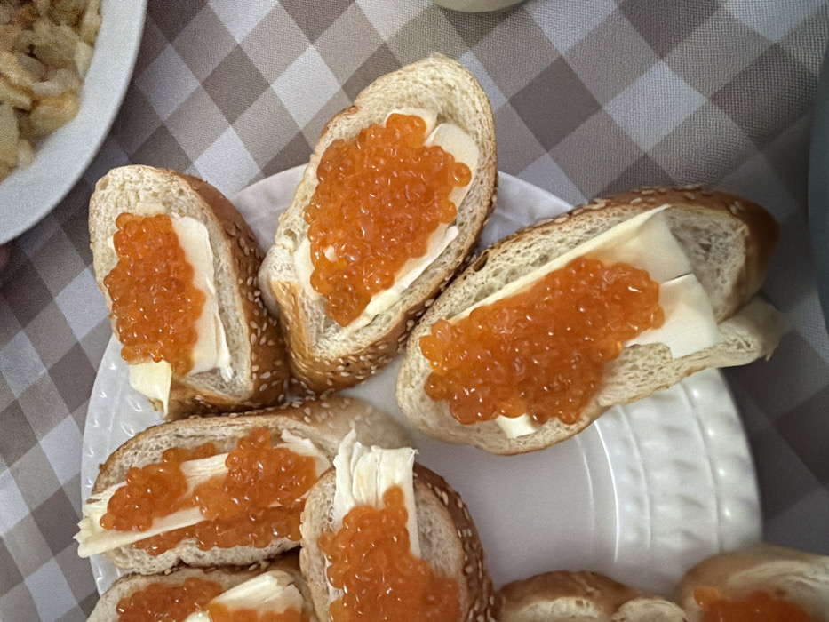 The image presents an overhead view of multiple food items arranged on a white ceramic plate. Each item is an individual canapé, consisting of an oval-cut slice of bread, likely a baguette, with visible sesame seeds on its crust. These bread slices are topped with a thin layer of a light-colored spread, consistent with butter or cream cheese, over which a generous portion of bright orange, spherical roe, identified as red caviar, is piled. The white ceramic plate features a raised, ribbed pattern along its rim. The items are situated on a surface covered by a light brown and white checkered tablecloth. In the upper right background, a portion of a second white plate is visible, containing light-brown, irregularly shaped fried food, consistent with potatoes. This scene is located in Nahariyya, Israel.