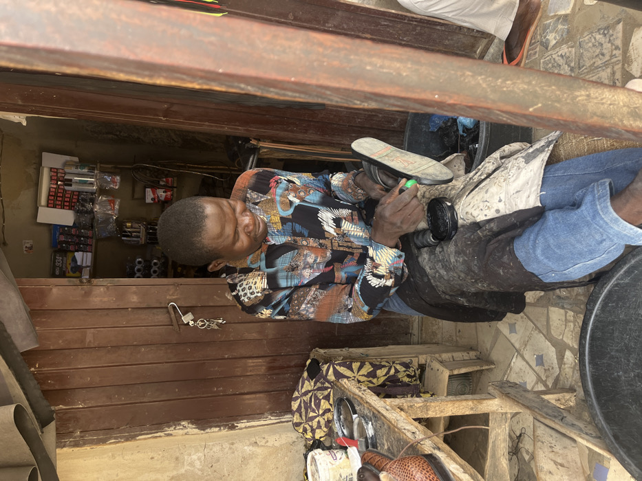 - "In Dzhidu, Nigeria, an adult male, likely a cobbler, is engaged in shoe repair within a semi-enclosed workshop space" by FM-marMB2, licensed under CC BY 4.0