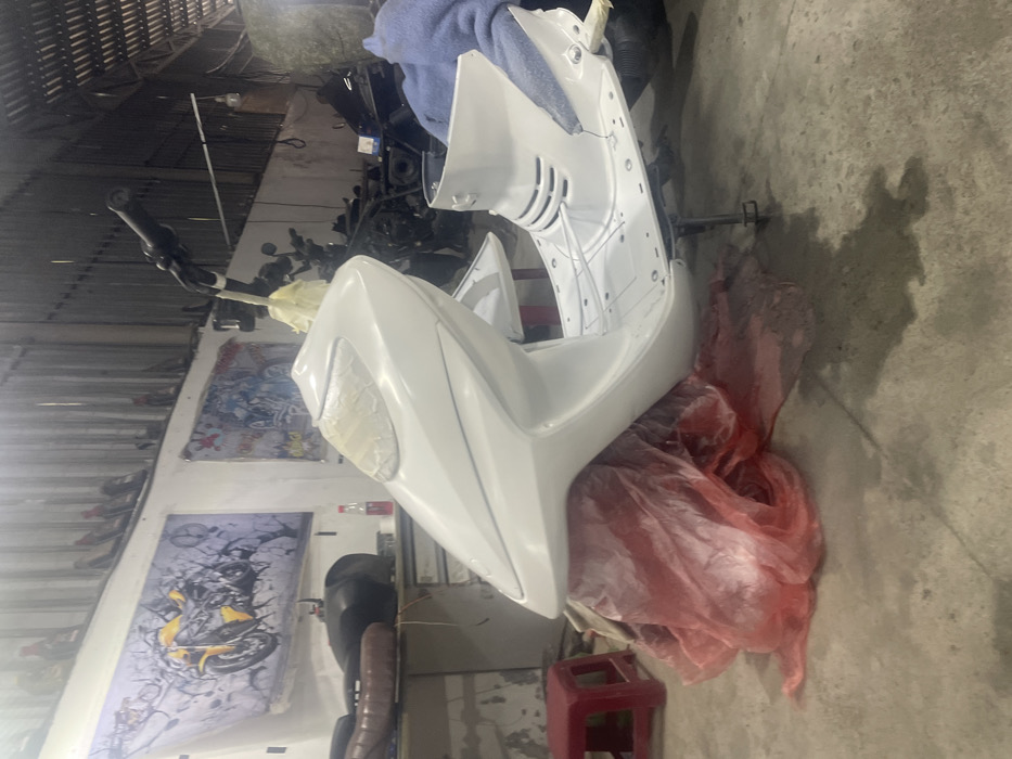 A white motorcycle frame dominates the scene, partially assembled with the front fairing receiving attention