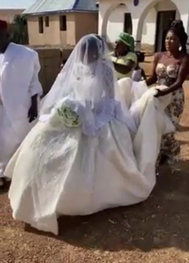 A wedding party is exiting a building. The bride is wearing a white gown and veil, holding a bouquet. A man in traditional white attire stands next to her, and two women are helping to carry the train of the dress. In the background, there are a couple of buildings. The camera then shifts to show a black SUV decorated with pink fabric and a shell-like ornament parked on a dirt lot.