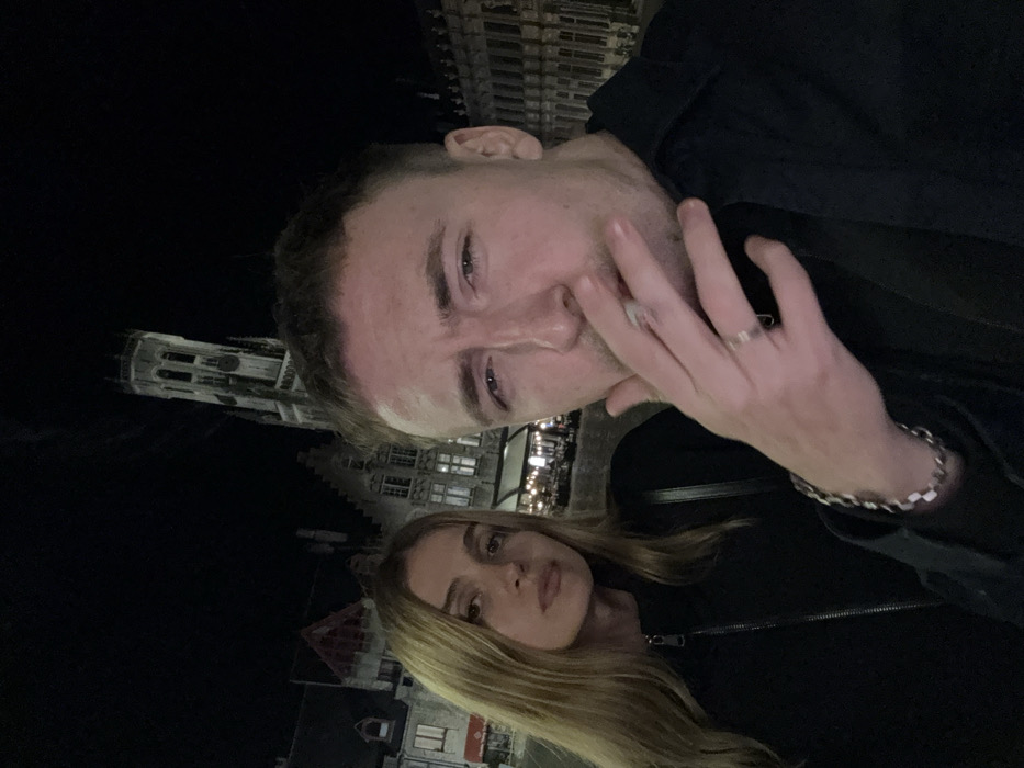 The image depicts two individuals, a male and a female, posing for a close-up photograph outdoors at night in the historic city center of Bruges, Belgium