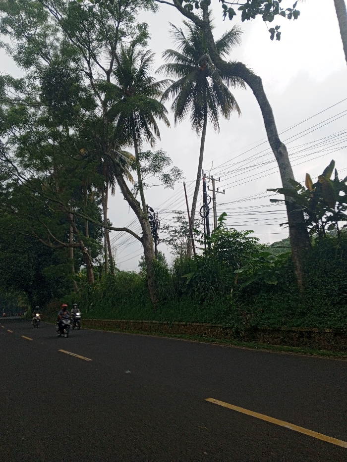 This image depicts a roadside scene in Qorday, Kazakhstan, under an overcast, light gray sky. A dark asphalt two-lane road occupies the lower portion of the frame, marked with a solid yellow line along its right edge and a broken yellow line further left. Three individuals operating dark motorcycles are visible in the mid-ground, traveling away from the viewer on the right side of the road. All three wear helmets; the central motorcyclist wears an orange or reddish-brown top. To the right of the road, a low, stacked stone wall separates the asphalt from dense, lush green vegetation. This vegetation includes multiple tall palm trees with slender, often curving trunks and abundant fronds, interspersed with other broadleaf trees and thick undergrowth, including identifiable banana plants. Several utility poles carrying numerous overhead power lines and communication cables are positioned within this dense foliage, extending horizontally across the mid-ground. Additional dense green trees and foliage are visible on the left side of the road, receding into the distance.