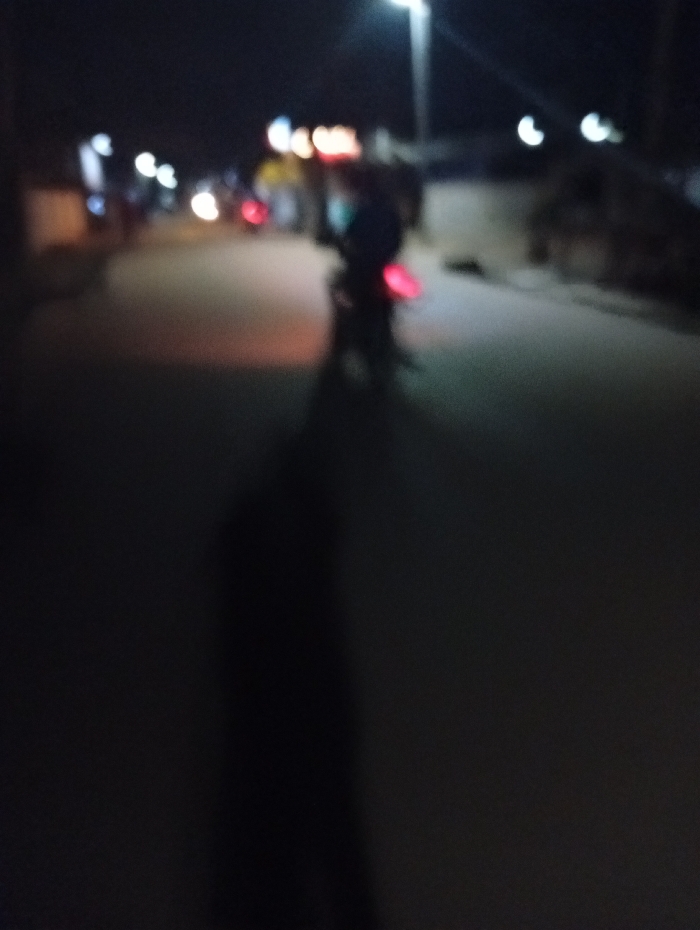 A blurry night scene depicts a street illuminated by distant streetlights and taillights of vehicles. A figure on a motorcycle is prominent, with the taillight glowing red. Other motorcycles and pedestrians appear as indistinct shapes further down the road. The foreground is dominated by the dark asphalt street.