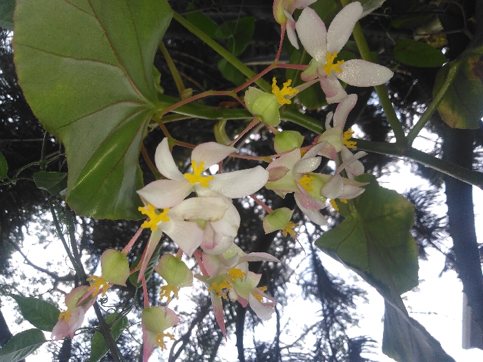 The image depicts a close-up of a flowering plant located in Arenal, Costa Rica, under overcast lighting conditions. The central focus is a cluster of approximately fifteen to twenty small flowers, predominantly white with subtle pale pink hues along the petal edges, each displaying bright yellow stamens/pistils. Numerous minute water droplets are visible on the petals and leaves. The flowers exhibit an irregular petal arrangement, typically comprising four to five petals per bloom. Several dark green leaves, varying in size, are present with distinct venation; a prominent, broad leaf, appearing somewhat heart-shaped, occupies the upper right quadrant of the frame. The plant's stems are slender and range in color from green to reddish-brown. The background consists of blurred, dark silhouettes of tree branches and foliage, indistinctly outlined against a bright, diffused sky. No people, animals, man-made objects, or specific actions/interactions are present in the scene.