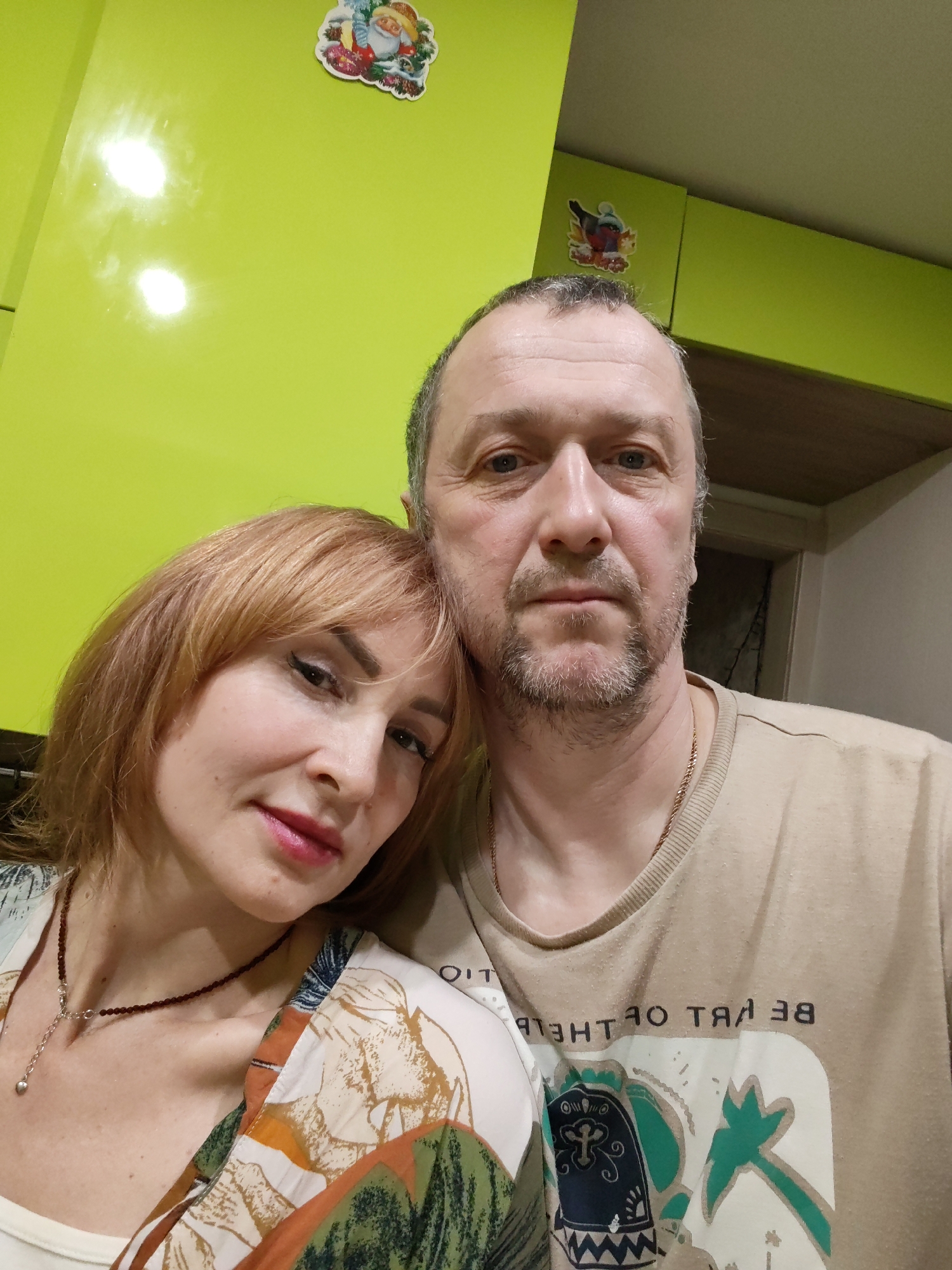 A selfie shows a man and a woman close together. The man has short, graying hair, a light beard, and is wearing a tan t-shirt. The woman has red hair with bangs, wearing a floral-patterned shirt and a beaded necklace. They are indoors, with a bright green wall and cabinet in the background decorated with stickers. The location is likely a home in Chaikovsky, Russia, as inferred from available data.