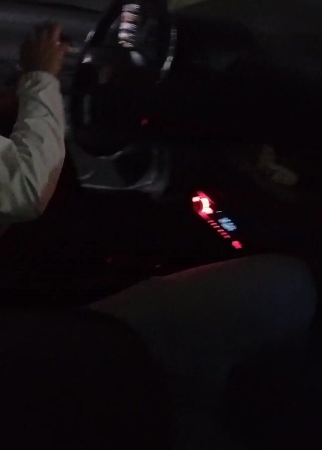 interior of a car at night. The person driving is wearing a light-colored jacket and is seen from the side. The car radio is on with red lights displayed. Someone is sitting in the passenger seat, wearing light-colored pants. The dashboard is visible, along with parts of the front windshield. There are signs with a dark color background and a white 'E' displayed outside the car. The car's interior is dark. The driver is moving the steering wheel. Music plays.