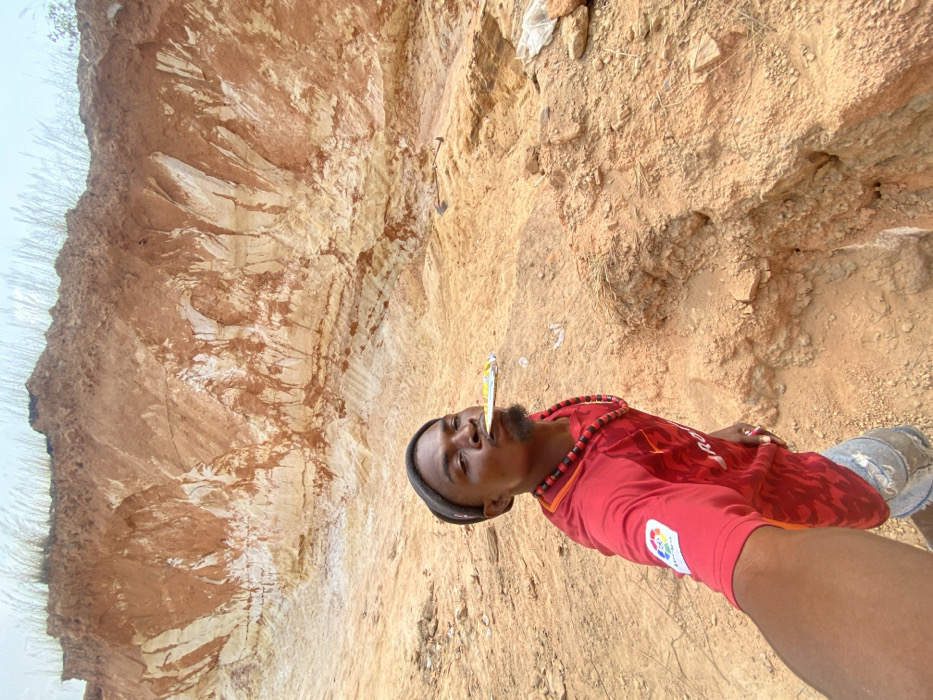 A single individual, an adult male with dark skin, is depicted in a selfie-style photograph within an active excavation or mining site in Amancho, Nigeria