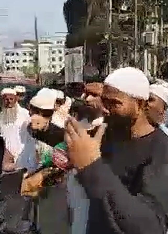 group of men gathered in an urban area. The man in the foreground is being interviewed by a person holding a microphone with a logo on it. The speaker is wearing a white cap and a black long-sleeved shirt, gesturing with his hands as he speaks. Several other men, some also wearing white caps, stand behind him. The setting appears to be a street with buildings, vehicles, and trees in the background.