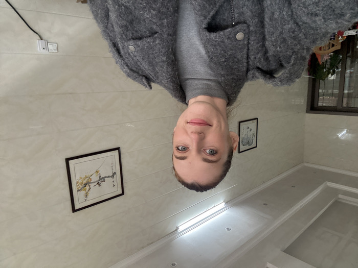 A fair-skinned woman with blue eyes faces the camera in an upside-down view. She wears a gray turtleneck and a textured gray jacket. Behind her, the backdrop consists of a light-colored tiled wall adorned with two framed pictures. A window is visible in the upper right corner. The ceiling includes a white border with recessed lighting, and a light fixture emits a bright glow.