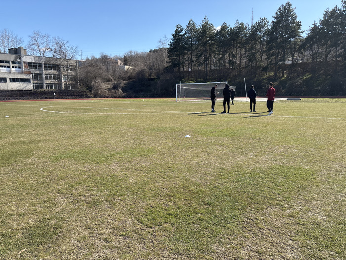 The image displays a football pitch within a stadium complex in Silistra, Bulgaria, under a clear daylight sky. The foreground grass field is sparse, showing green and brown patches. White field lines, including an arc and a straight line, are delineated, along with two small white marker cones. In the midground, five individuals, likely adult males, stand near a white-framed goalpost equipped with a net. Four individuals wear dark athletic wear, while one on the far right wears a red top. They are positioned in a loose cluster, facing inward, without overt physical activity. To the left, a reddish-brown athletic track curves around the field, adjacent to empty, dark-colored stadium seating. Behind the seating, a multi-story concrete building with multiple window arrays is visible. The background consists of a steep hill, densely covered with coniferous trees on the right and sparse, bare deciduous trees on the left. A tall, slender structure, consistent with a communication tower, is faintly discernible atop the distant hill.
