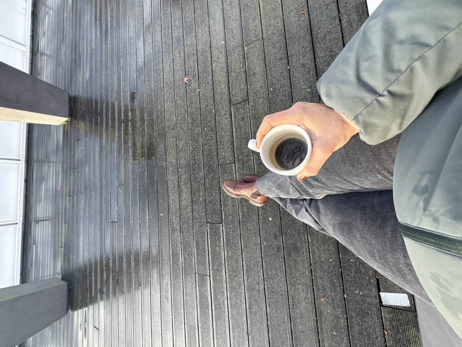 A first-person, downward-facing perspective captures an individual seated outdoors on a dark grey, wet wooden deck in Boulogne-Billancourt, France. The subject wears grey trousers and brown leather boots. Their right hand holds a white ceramic mug containing a dark liquid. A portion of a green padded jacket is visible on the upper body. The wet wooden planks of the deck exhibit reflections of overhead light. A single reddish-brown leaf rests on the decking near the subject's feet. In the upper background, light-colored concrete architectural supports and a segment of a white building facade are visible.