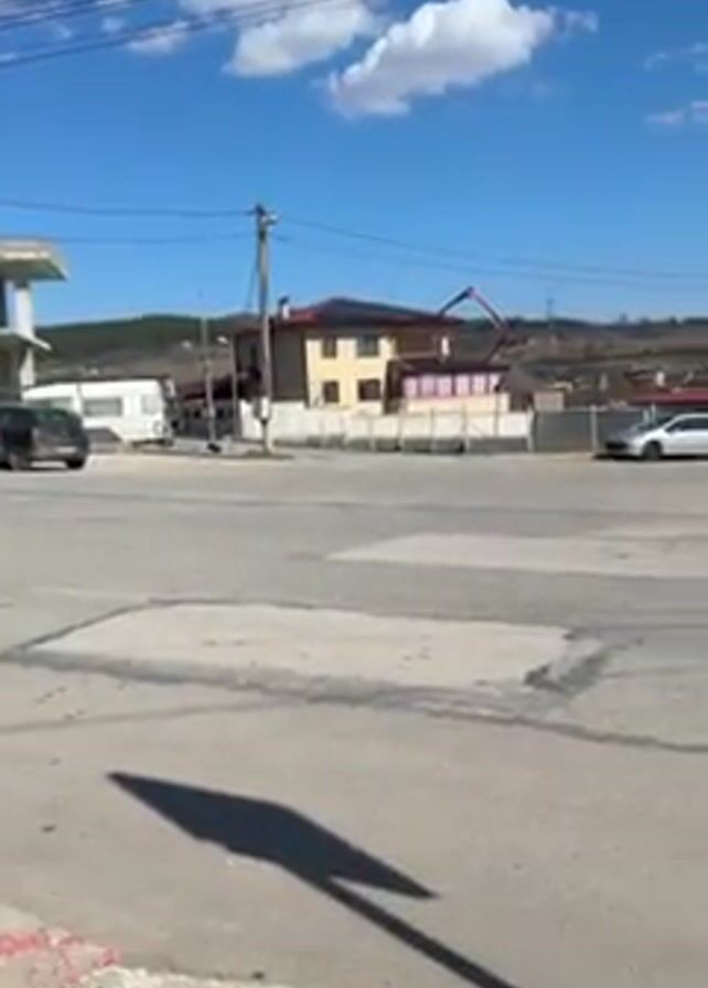 street scene on a sunny day with some clouds in the blue sky. The camera is positioned near the edge of a sidewalk. In the background, there is a two-story building with a Bulgarian flag on top, two parked cars, and a white camper. To the right of these, a two-story yellow building with a purple roof can be seen behind a fence. Further into the background, there are power lines and hills. A light-colored car drives across the street in the distance. The shadow of the camera mount is visible in the foreground on the pavement.
