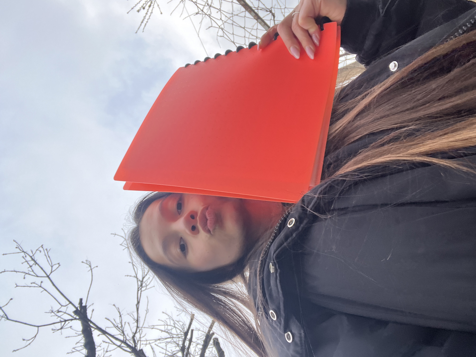 A single individual is depicted in an upward-angled outdoor photograph, presumably a selfie, taken in Targovishte, Bulgaria. The subject, appearing female, has long, dark brown hair with lighter brown streaks, some strands blowing slightly. She is wearing a dark, possibly black, padded jacket with visible silver-toned snap buttons and a zipper. Her face is partially visible, with her left eye open and her lips puckered into a "kissing" expression. She holds a bright, neon orange, spiral-bound notebook or binder vertically with her right hand, obscuring the right side of her face. Her fingers display manicured light pink nails, and a silver-toned ring is visible on her right ring finger. The background consists of a predominantly light grey, overcast sky and a network of bare, dark tree branches, indicative of a dormant season such as winter or early spring.