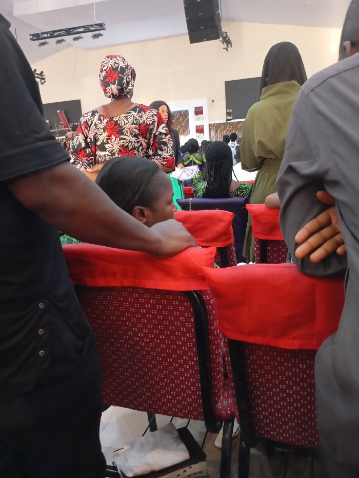 gathering of people indoors, likely at an event or ceremony. Several individuals are visible, including a woman with a headscarf in a floral pattern, another in a green garment with a hijab, and others with various hairstyles. They are seated in chairs covered with red fabric, with one person's hand resting on the back of a chair. The lighting is bright, and the setting seems to be a hall or auditorium with lighting fixtures visible on the ceiling.