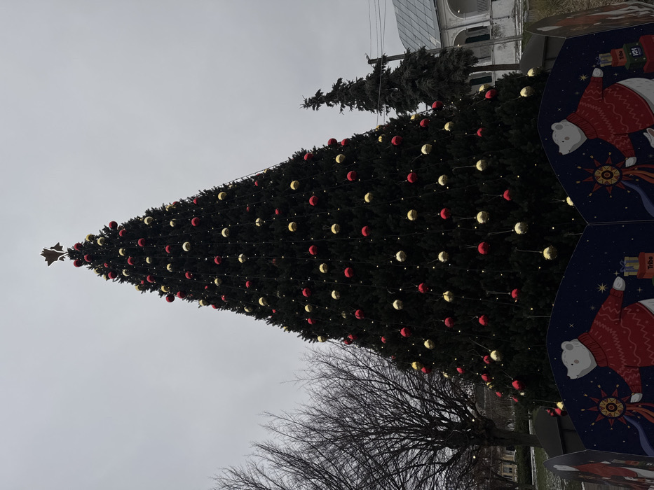 - "An imposing, artificial Christmas tree, heavily decorated with red and gold spherical ornaments and white lights, stands under an overcast, gray sky in an urban public space in Bila Tserkva, Ukraine" by FM-h3gDx2, licensed under CC BY 4.0