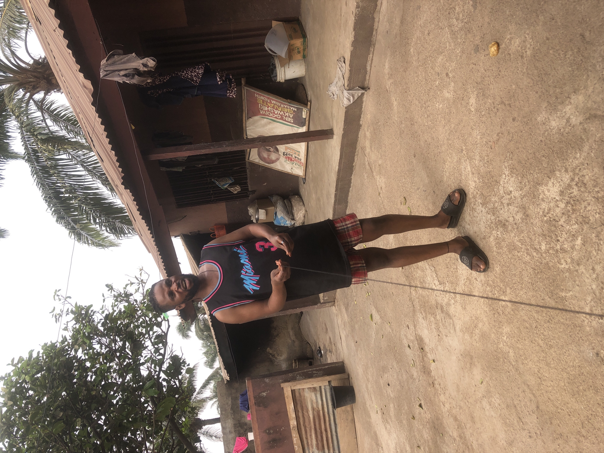 A man stands on a concrete surface in an outdoor environment in Akwanga, Nigeria. He is wearing a black "Miami" jersey and red plaid shorts, with dark-colored sandals. He is holding a string. The surroundings include a building with a corrugated metal roof, trees, and a faded political poster attached to the building. Other miscellaneous items such as buckets and clothing are visible near the building. The concrete surface appears uneven.