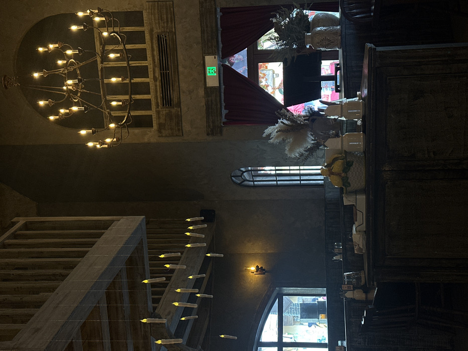 The image depicts the interior of a dimly lit, themed establishment, likely a restaurant or cafe, located in Licheng District, China. The scene has a gothic or fantasy aesthetic. A prominent feature is a large, two-tiered metal chandelier with approximately two dozen illuminated faux candles, suspended from the ceiling in the upper right quadrant. Below it, an architectural recess and a horizontal wooden panel with a dark air vent are visible. In the upper left, a wooden balcony railing with vertical balusters extends across the frame. Below this railing, numerous faux "floating candles" with yellow flames are suspended at varying heights by thin, translucent lines. The walls are textured, appearing dark gray or brown with a distressed finish. On the left, a wide arched window provides a view of a brighter exterior, possibly a street or courtyard, with faint colors and shapes. A single wall sconce with a warm, glowing bulb is mounted on the wall below this window. A tall, narrow arched window with vertical mullions is situated further right. In the foreground, a dark, rustic wooden counter or cabinet runs horizontally. Upon this counter are various objects: several clear glasses, small condiment shakers/bottles, a tissue dispenser, a white woven basket containing yellow decorative items resembling lemons, and two white ceramic dispensers. Behind these items, two large vases hold dried floral arrangements, including light-colored pampas grass. In the background, beyond the counter, red velvet-like curtains are partially drawn over a glass doorway or large window, revealing a brighter area beyond. Above these curtains, a green illuminated "EXIT" sign, including Chinese characters, is visible. Partial views of dark wooden chair backs are visible on the far left and right. No individuals are present in the observable frame.