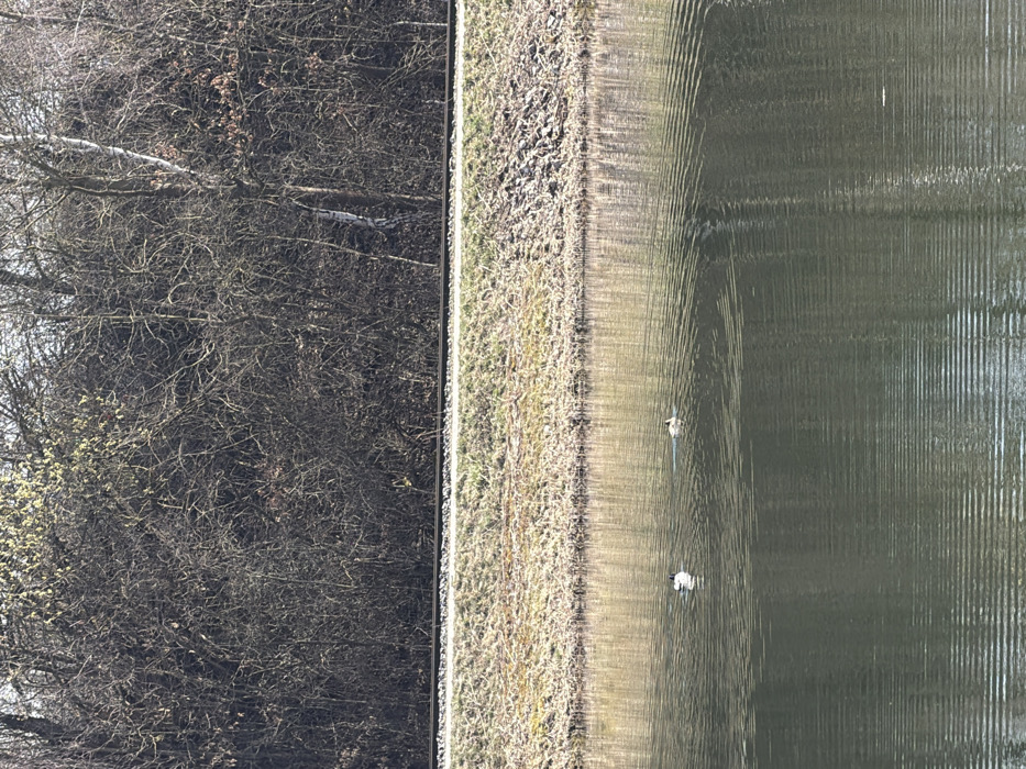 This image depicts a natural and industrial environment in Fürth, Germany, under clear daylight conditions. The foreground features a calm body of water, likely a canal or river, reflecting the sky and surrounding vegetation. Two ducks are present on the water, both swimming and generating ripples; one duck is predominantly white with a dark head and neck, positioned on the left, while the other is brownish-tan with a darker head, located further right and slightly behind. Above the water, a gently sloped embankment rises, covered primarily with dry, light brown vegetation and scattered green patches, possibly moss or early spring growth. This embankment supports a single railway track, consisting of two parallel rails, which traverses horizontally across the midground of the frame. The immediate ground surrounding the track is also covered in similar dry vegetation. The background is dominated by a dense, deciduous treeline or forest, appearing mostly bare of leaves, indicating late winter or early spring. Sparse patches of light green or yellowish budding foliage are visible, particularly on the left side of the treeline. A prominent birch tree with distinctive white bark stands out towards the right side of the forested area. The sky, visible above the treeline, appears bright and unobstructed. No individuals or man-made structures other than the railway track are discernible.