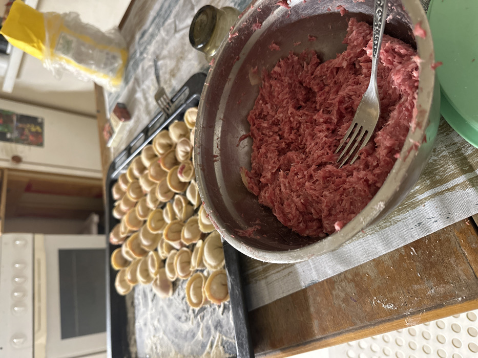 This image captures a domestic kitchen scene in Krasnoyarsk, Russia, centered on the preparation of dumplings
