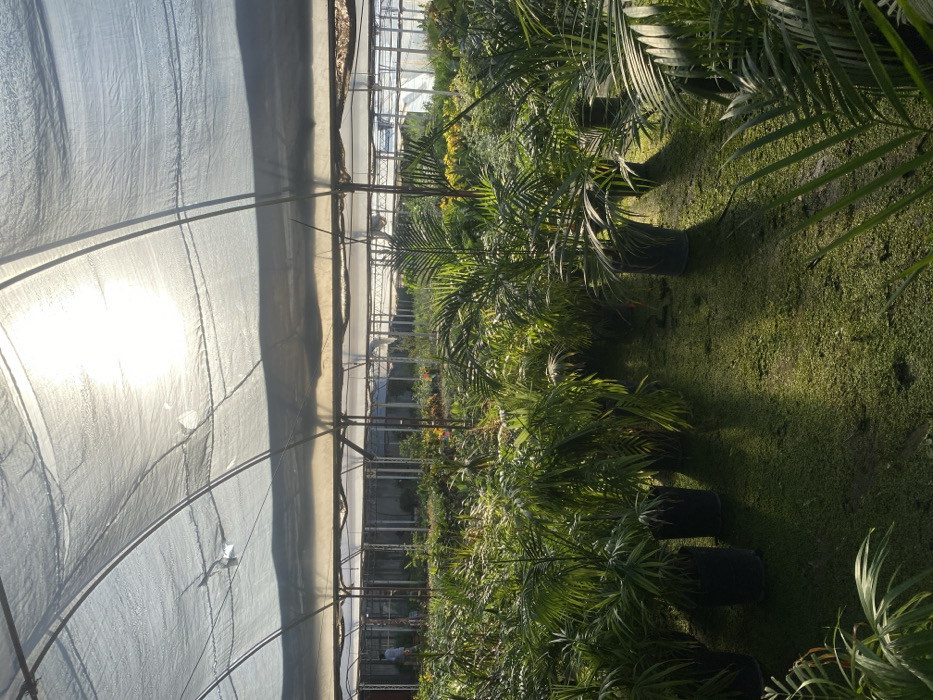 The image displays the interior of a commercial plant nursery or greenhouse, stated to be located in Santa Rosa, Argentina. The overhead structure features a translucent, light-filtering mesh canopy, likely a shade cloth, supported by a series of metal or PVC pipe arches. Bright sunlight penetrates this canopy, creating strong illumination and casting distinct shadows across the ground surface. The ground is largely covered by a dense, low-growing green groundcover, interspersed with areas of visible soil. Numerous plants, primarily characterized by their slender green fronds, consistent with palm varieties such as Areca palms, are cultivated in dark-colored, cylindrical plastic pots. These potted plants are arranged in discernible rows extending throughout the visible area. In the far-left background, a single individual is present, seen from behind, wearing a light-colored shirt and dark trousers. The person appears to be walking or standing amongst the cultivated plants. No specific interactions between individuals or distinct actions beyond general movement are discernible.