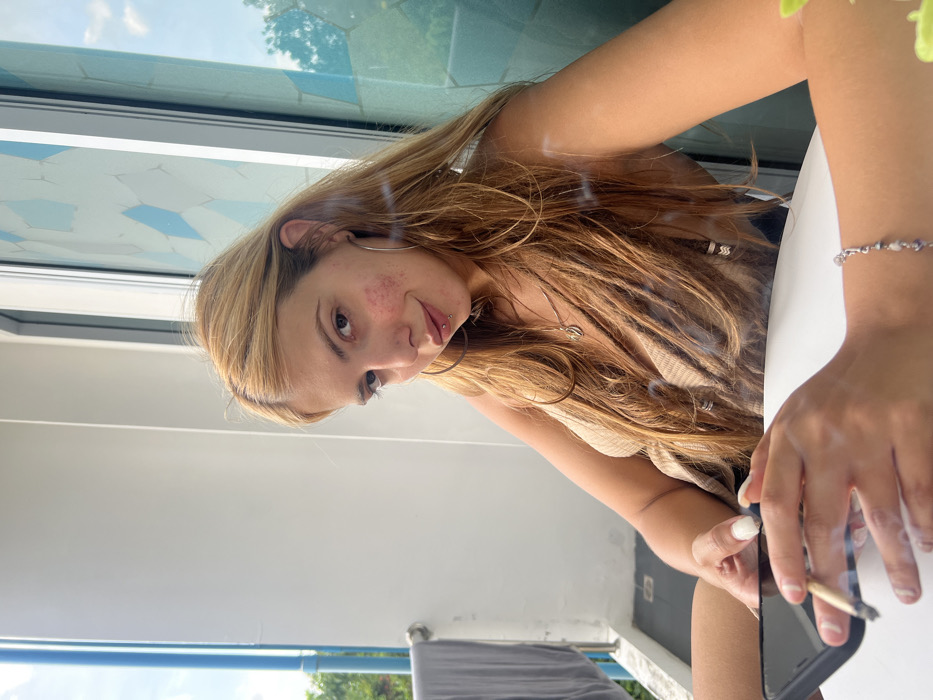 An adult female is depicted seated at a white table on an outdoor balcony in Baan Bo Phut, Thailand. She possesses long, light brown hair and is looking directly towards the viewer with a slight smile. The subject has a stud piercing on her lower lip and visible blemishes on the right side of her face. She wears large silver hoop earrings, a silver necklace with a circular pendant, and a silver-colored bracelet with beads on her right wrist. Her attire consists of a light brown ribbed tank top. In her left hand, she holds a dark-cased smartphone, with her thumb positioned on the screen. Her right hand holds a lit, hand-rolled cigarette or joint, from which smoke is visibly emanating. The immediate environment includes a white wall to the left, a blue railing over which a grey fabric is draped, and a large window or glass door with a geometric blue and white pattern to the right. Beyond the balcony, a clear blue sky with sparse clouds and green foliage is visible. The scene is illuminated by natural daylight.